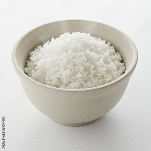 Freshly Cooked White Rice in Simple Ceramic Bowl on White Background