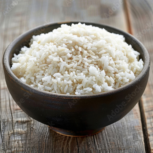 Freshly cooked white rice is served rustic bowl, showcasing its fluffy texture and inviting appearance. This staple food is perfect for various meals and evokes sense of comfort and satisfaction