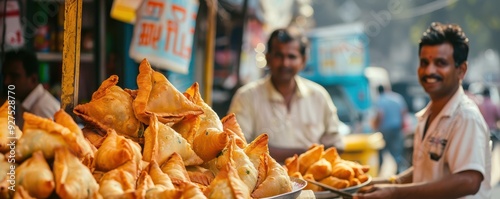 Freshly fried samosas steaming hot, served by a street vendor in a vibrant Indian market.