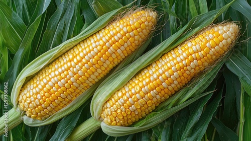 Freshly harvested corn cobs resting on vibrant green leaves in a sunny field