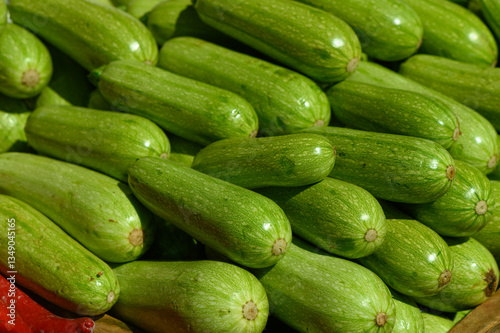 Freshly harvested green zucchinis stacked together at a vibrant local market in mid-summer sunshine