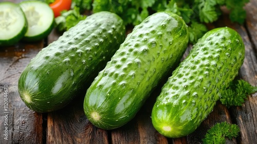 Freshly harvested organic cucumbers arranged on a rustic wooden table with herbs and vegetables in a greenhouse setting