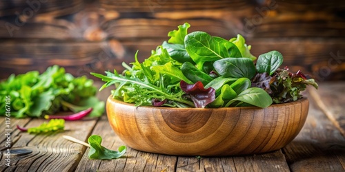 Freshly harvested organic mixed greens in a rustic wooden bowl
