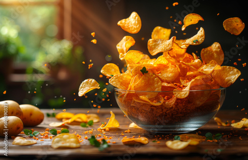 Freshly made chips fly into a bowl. Crispy potato chips are airborne as they are tossed into a clear glass bowl on a wooden table, surrounded by potatoes.