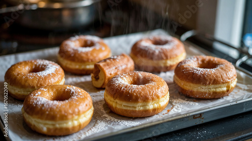 Freshly made donuts steam on a metal tray