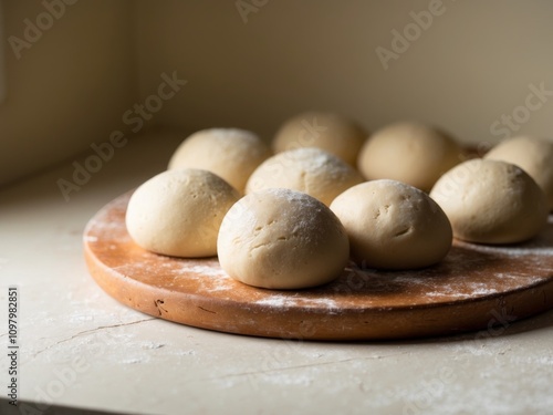 Freshly Made Dough Balls Resting on a Wooden Board in a Cozy Kitchen Ready for Baking Bread.