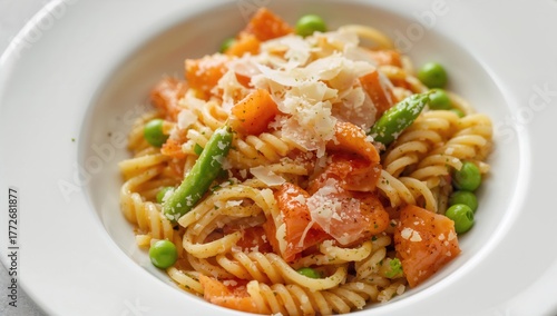 Freshly made fusilli pasta with salmon, green peas, parmesan, and lemon zest. Nutritious meal