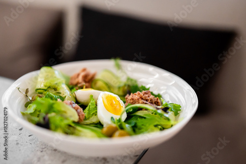 Freshly made Niçoise salad with tuna, boiled egg halves, cucumber, olives, and greens in a white bowl. Healthy, appetizing, natural lighting, nobody