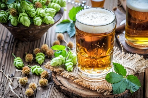 beer, hop, cone, wooden, table, glasses, foam, ales, lager, craft, brewery, bitter, favor, freshness, alcohol, beverage, drink, cold, pint, pub, bar, rustic, traditional, homebrew, gold, transparent, carbonated, froth, liquid, pour, refreshment, malt, yeast, fermentation, wood, bubbly, coaster, leaf, green, nature, organic, artisanal, serving, casual attire, relaxation, leisure