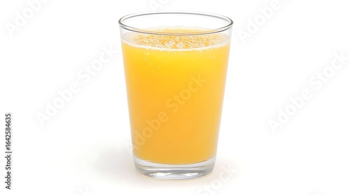 Freshly poured glass of orange juice displaying tiny bubbles, isolated on white background taken with DSLR 85mm lens, soft light and crisp detail