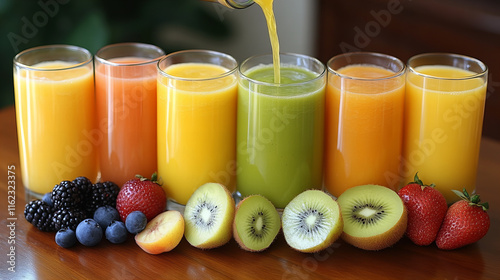 Freshly poured vibrant smoothies in various colors, showcasing healthy blend of fruits. colorful display includes strawberries, blueberries, kiwi, and more, evoking refreshing and nutritious vibe