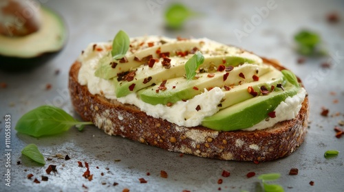 Freshly prepared avocado toast sits elegantly on a wooden board. This delightful dish features creamy cheese topped with green avocado slices and herbs, set against a rustic background