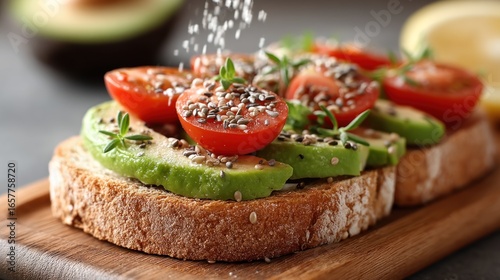Freshly prepared avocado toast with cherry tomatoes, herbs, and seeds is sprinkled with seasoning, showcasing a healthy and delicious breakfast or snack.