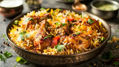 Freshly prepared biryani rice with chicken, garnished with herbs and served with raita