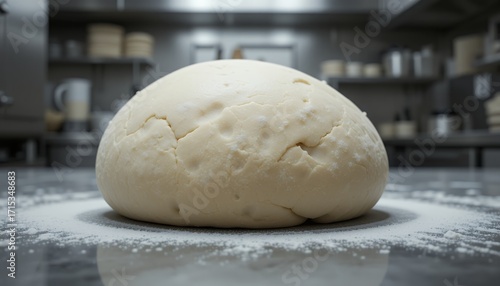 freshly prepared dough ball resting on floured surface in professional kitchen environment