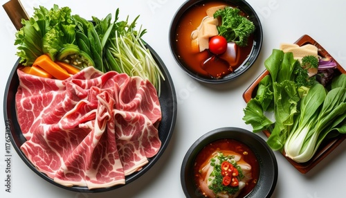 Freshly Prepared Shabu Platter with Thinly Sliced Meat and Colorful Vegetables Served in Bowls
