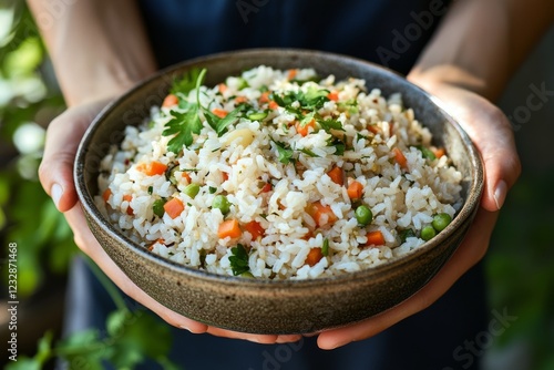 fried, rice, vegetable, bowl, fresh, ingredient, person, carrot, pea, cilantro, healthy, meal, cooking, vegetarian, dish, culinary, cookery, preparation, green, background, textured, summer, food, vibrant, colours, wholesome, receipe, flavorful, serving, lunch, dinner, home, garden, texture, delicious, herb, natural, light