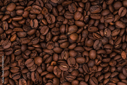 Freshly roasted coffee beans background texture. Close-up, top view.