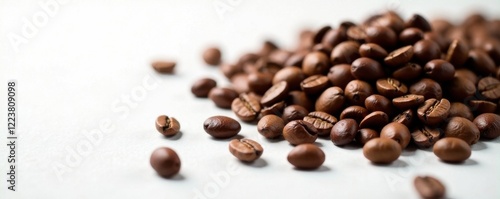Freshly roasted coffee beans scattered on a white surface, white background, roast