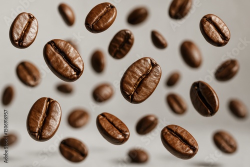 Freshly Roasted Coffee Beans Suspended in Air, a Simple Composition Showcasing Texture and Aroma of Coffee, Perfect for Beverage and Food Related Projects.