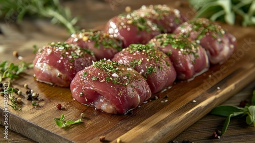 Freshly Seasoned Meat Rolls with Herbs on Wooden Cutting Board