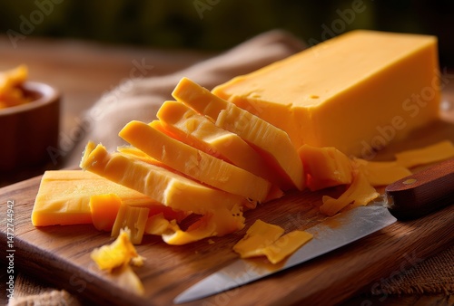 Freshly Sliced Cheddar Cheese on Wooden Cutting Board with Kitchen Knife and Shavings, Perfect for Culinary Creations and Cheese Platter Presentation