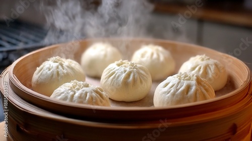 Freshly Steamed Dumplings in Bamboo Steamer with Steamy Atmosphere and Delicious Appearance, Ideal for Food Photography and Culinary Art Projects
