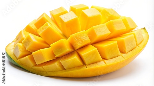 Freshly-cut, vibrant yellow mango slice with creamy white interior, arranged on a clean white background, showcasing its juicy flesh and intricate texture in high detail.