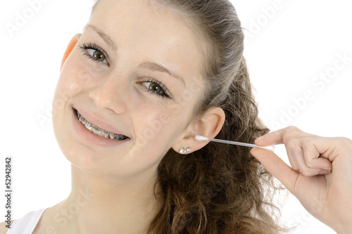 ear, cleaning, schoolgirl, smile, smile, hearing, cotton, bodycare, bathe, fun, youth, young, missy, girl, sympathetic, pretty, friendly, braces, brunette, ponytail, studio, isolated, no, background