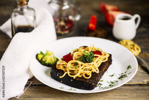 fried black bread with spaghetti and vegetables on a plate on a wooden table