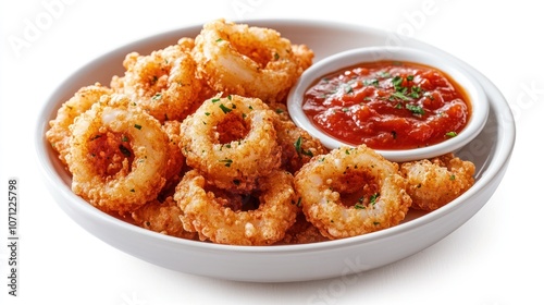 fried, seafood, ring, food, dinner, meal, cookery, italian, dish, plate, sauce, marinara, tomatoes, dip, tasty, delicious, crispy, breaded, crunchy, favor, lunch, eatery, white, background, isolated, close, up, culinary, gastronomy, eat, appetising, fresh, healthy, epicure, deliciously, comfort