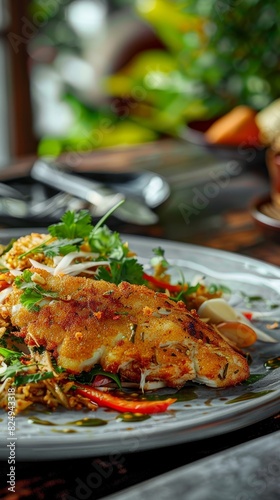 Fried catfish with green mango salad, crispy fish with tangy salad, riverside dining setting