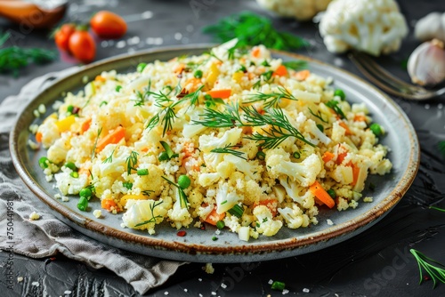 Fried cauliflower rice or couscous with dill on plate, healthy low carbohydrates vegetable side dish for keto diet and healthy low calories nutrition on rustic stone background