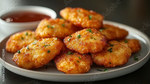 Fried cheesy bites, golden & crisp, sit atop a plate next to dipping sauce