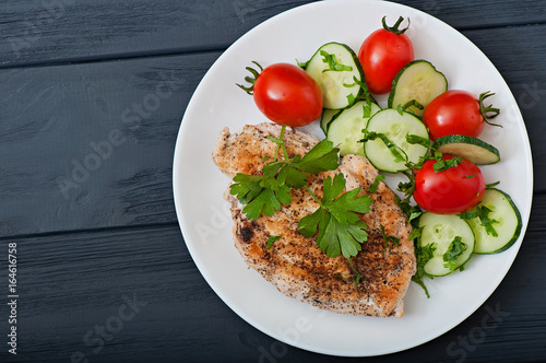 bar-b-q, bar-b-q, breast, chicken, cooked, cooking, diet, dinner, eat, fillet, food, fresh, fried, green, grill, grilled, healthy, meal, meat, plate, poultry, roasted, salad, steak, tomatoes, top, vegetable, view, white, wooden