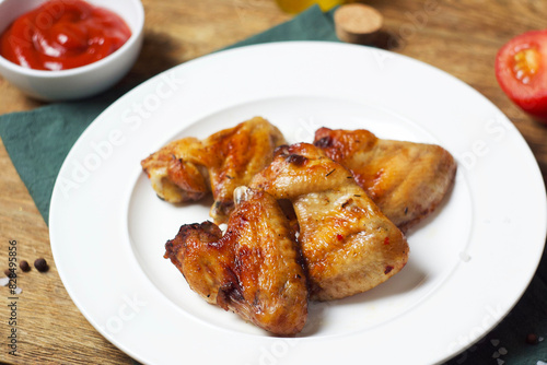 chicken, chicken wings, fried, food, poultry, hot, plate, table, wooden, towel, pepper, oil, ketchup, red, lunch, fats, glare, closeup
