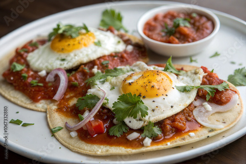 Fried Eggs on Crispy Tortillas with Salsa and Beans