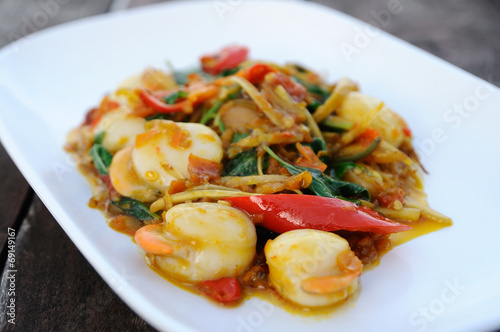 Fried herbal vegetables with hotate, Spicy Thai food.