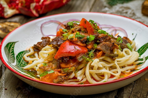 meat, asian, vegetable, plate, food, traditional, meal, dinner, cookery, pasta, fried, lamb, healthy, uzbek, culture, tasty, epicure, national, spice, beef, lunch, eatery, uzbekistan, table, dish, bowl, onion, parsley, noodle, mouton, appetising, old wood, selective focus, soft focus, wooden, wood