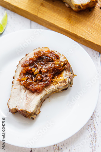 pork meat, chop, food, fresh, grilled, pepper, steak, grill, top, view, up high, bar-b-q, beef, meat, nobody, protein, roast, roasted, slice, sliced, background, beefsteak, board, butcher, cooking, cutting, preparation, rosemary, rustic, space, topview, uncooked, wooden, cooked, cut, fat, meal, bone, pig, dark, thyme, baked, big, brown, serving, plate, ceramic, white, table
