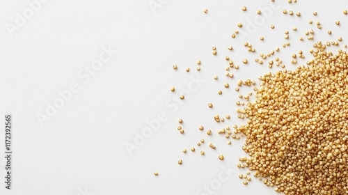 Fried quinoa scattered on a white background for culinary and health-related concepts in food photography.