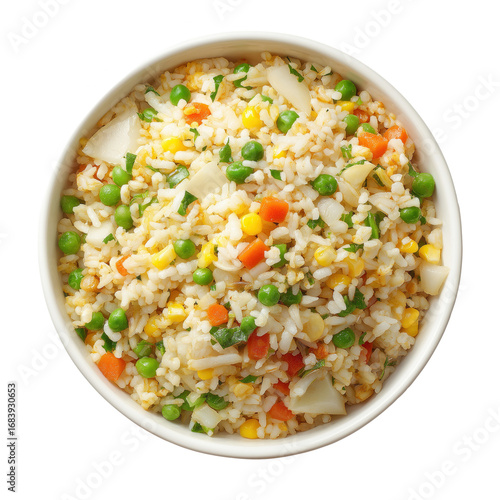 Fried rice with mixed vegetables including peas, corn, carrots, and herbs served in white bowl, offering colorful and appetizing meal with fresh ingredients and vibrant textures