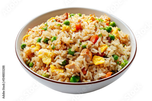Fried rice with peas, scrambled eggs, red bell peppers, and beef pieces in ceramic bowl isolated on white transparent background, concept of Asian cuisine
