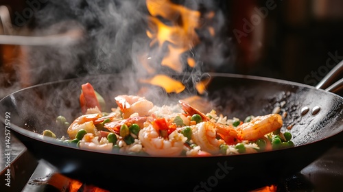Fried rice with shrimp, peas, and egg in a hot wok