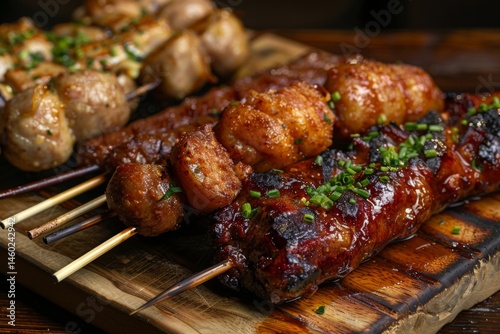 Fried sausages and grilled meat