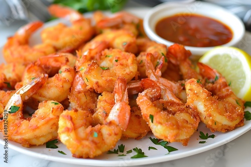 fried shrimp arranged on a platter, golden and crispy, glistening with a perfectly fried texture. Include a small dish of hot sauce on the side