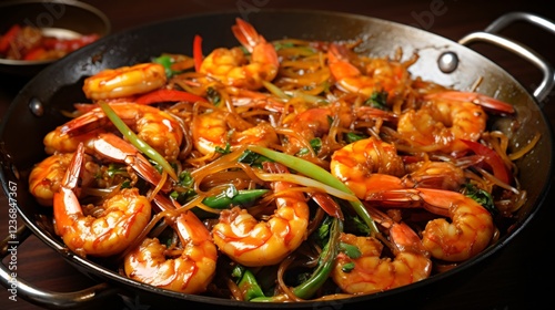 Fried shrimp with garlic and Spicy Sauce in a pan close-up