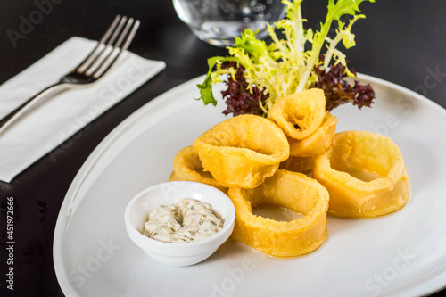 Fried squids or octopus. Fried calamari with tartar sauce.