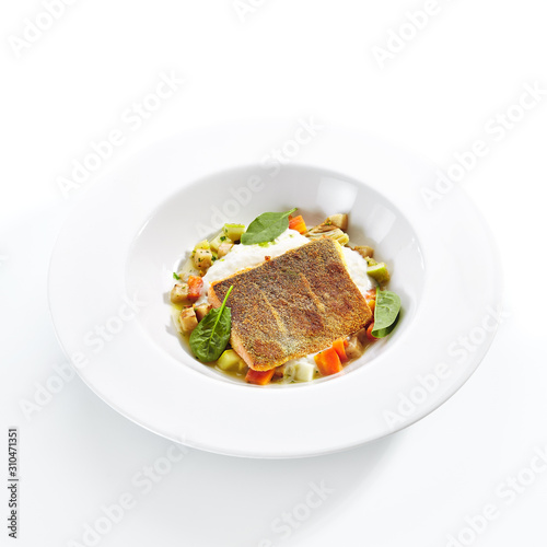 fried, trout, fillet, vegetable, stew, fennel, thyme, lemon, white, eatery, plate, isolated, delicious, exquisite, serving, red, fish, salmon, meat, seafood, close, up, foam, food, epicure, meal, dish, dinner, fresh, lunch, tasty, healthy, cooked, traditional, cookery, table, background, luxury, eat, nourishment, cooking, dining, prepared, nobody, served, high, menu
