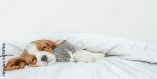 Friendly Cavalier King Charles Spaniel sleeps and hugs tiny kitten on the bed at home. Empty space for text